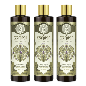 Zestaw zawiera: 3 x Naturalny szampon do włosów osłabionych i wypadających.Proteinowy szampon do codziennej pielęgnacji włosów wypadających. Nadaje objętości, przywraca naturalny blask i zdrowy wygląd.